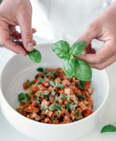 Affettate la melanzana e fatela saltare in padella con l'aglio e qualche cucchiaio d'olio. Tagliate i pomodori a cubetti piccoli con un coltello affilato, trasferiteli in una ciotola, unite qualche fogliolina di maggiorana e di basilico, condite con un giro d'olio e sale, mescolate e tenete da parte la dadolata.