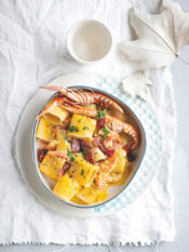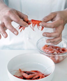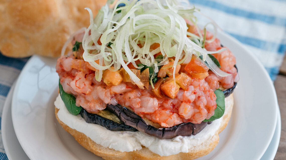 Ingredienti freschissimi per questa proposta gourmand con crostacei, formaggio Dop e ortaggi di stagione