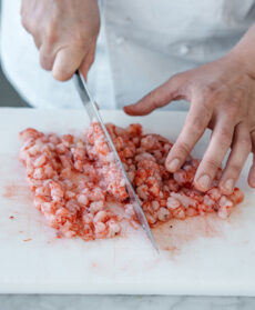 Tagliate i gamberi a dadini con un grosso coltello poi condite la tartare con olio, la scorza del limone grattugiata, sale pepe. Aggiungete un paio di teste, tritate il tutto con il coltello e amalgamate.