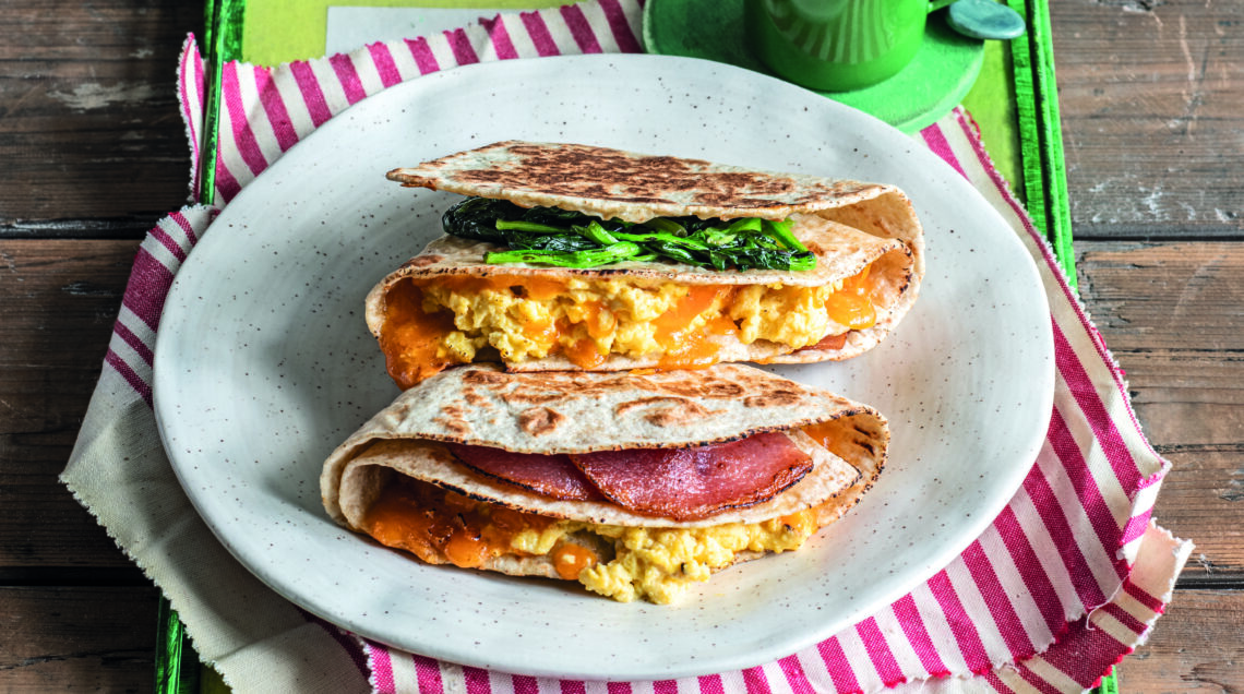 5 Tritate grossolanamente il cheddar. Scaldate le piadine sopra una piastra. Praticate un taglio dal bordo fino al centro con le forbici. Mettete da una parte del taglio un po' di spinaci su un terzo della piadina, a lato 2 cucchiai di uova strapazzate su un altro terzo, cospargete con il formaggio cheddar e completate la piadina con 2 fettine di bacon divise a metà.