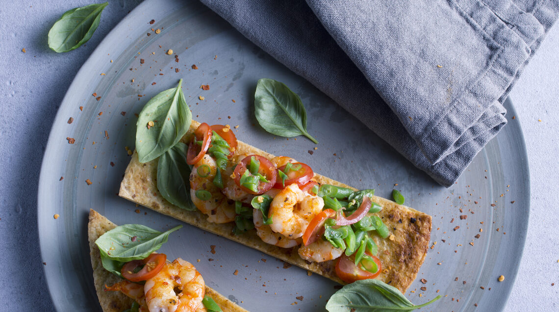 Una pennellata di olio, sale e lime e le piadine sono pronte per diventare bruschette sotto il grill in pochi minuti. Gamberi grigliati, verdure e basilico sono molto più di una semplice decorazione