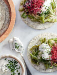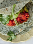 1) Prepara gli ingredienti per le tortillas con pollo e fagioli. Taglia a metà i friarielli nel senso della lunghezza e privali dei semi. Tuffa i pomodori per qualche secondo in un pentolino di acqua bollente; privali della pelle e riduci la polpa a cubetti. Sbuccia lo scalogno e taglialo a spicchi sottili e piccoli. Lava le foglie di coriandolo, asciugale e tritale.