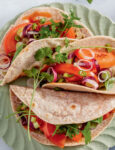 3) Completa e servi le tortillas con pollo e fagioli. Scalda le tortillas su una piastra antiaderente senza condimento e disponile sui piatti. Metti sopra ciascuna metà una foglia di insalata, lavata e asciugata, una cucchiaiata di fagioli rossi ben sgocciolati e il pollo con i peperoncini e la salsa piccante. Piega le tortillas con pollo e fagioli in quattro e servile calde e croccanti.