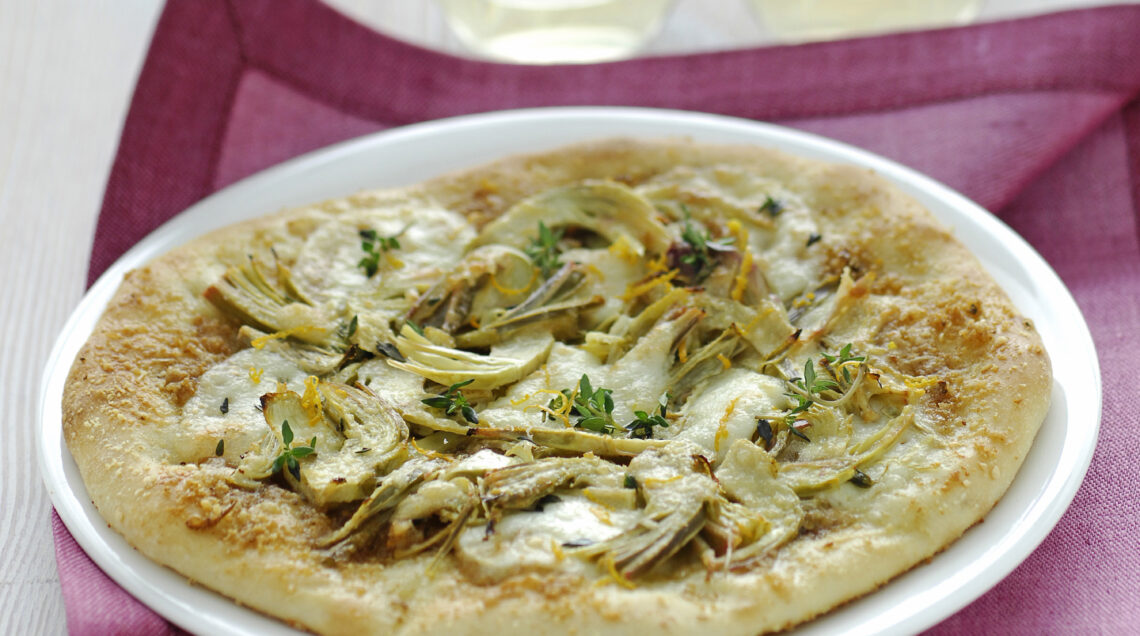 6) Aggiungi i carciofi distribuiti in maniera uniforme, condiscile con 4 cucchiai d'olio e un pizzico di sale, spolverizzale con il parmigiano grattugiato e cuoci la pizza bianca alla mozzarella e arancia in forno già caldo a 220° per circa 20 minuti.
