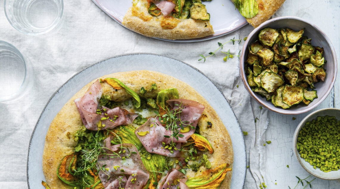 5) Stendete l'impasto in un disco di 34 cm di diametro, distribuite la crema di zucchine, aggiungete il fiordilatte e cuocete in forno a 240° per 18 minuti.