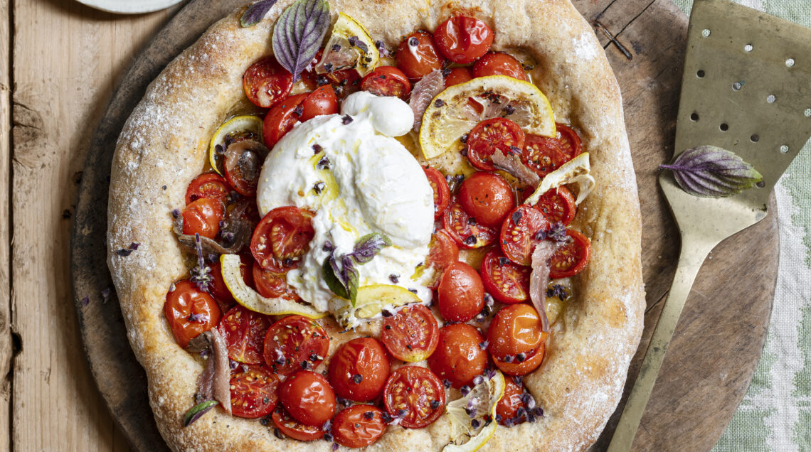 4 Scaldate il forno a 220°. Stendete una porzione di impasto fino a formare un disco, quindi sistematelo sulla placca rivestita con carta da forno, farcite con 1/4 dei pomodorini tagliati a metà e fettine sottilissime di limone, sale e un filo di olio e infornate per 10 minuti, e per altri 3-4 minuti sotto il grill.