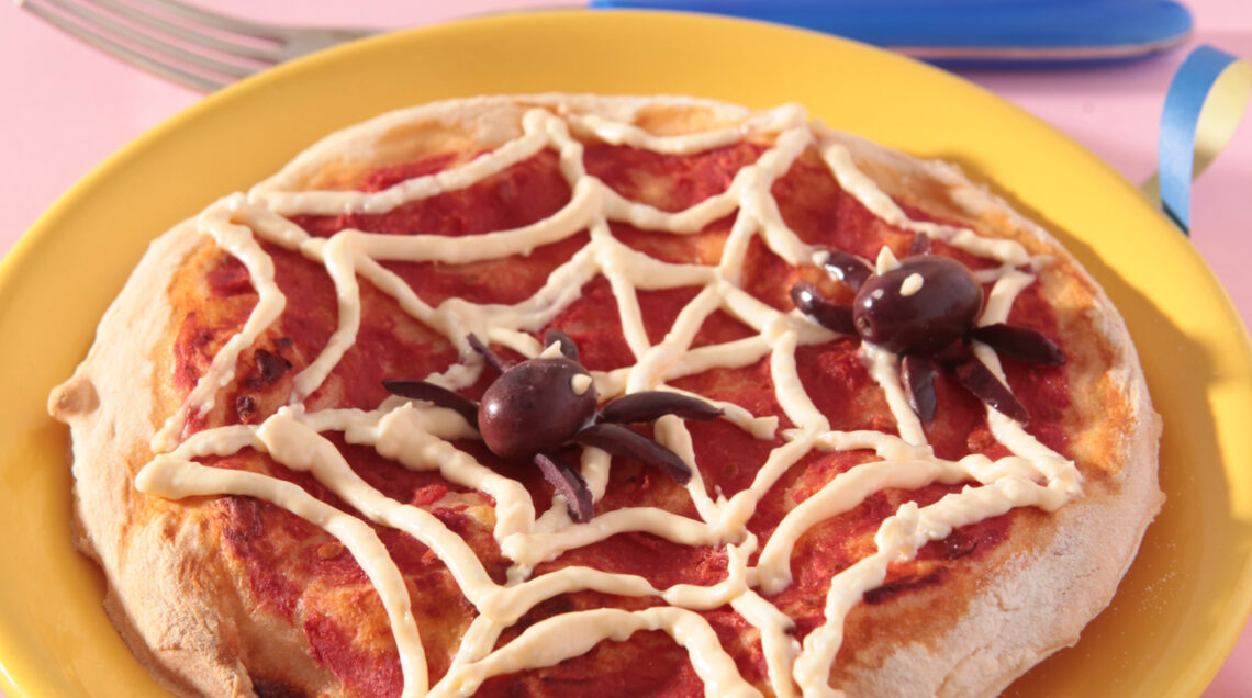 3) Sforna le pizze e con il cono in carta da forno disegnaci sopra delle ragnatele. Taglia le olive e confeziona alcuni ragnetti utilizzandole un paio per volta.