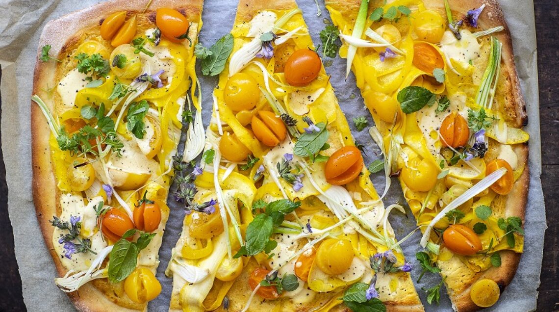 Questa ricetta parte da una base pronta: la pasta per pizza già lievitata, che potete acquistare fresca al supermercato o dal panettiere. La guarnizione è tutta giocata sui colori del sole: infatti, sono gialli le zucchine e il peperone, gialli e arancioni i pomodorini. Naturalmente, si possono anche sostituire con i loro corrispondenti verdi e rossi! Come erbe, sbizzarritevi: noi abbiamo scelto basilico, menta, prezzemolo, timo, ma nulla vi vieta di usarne diverse o aggiungerne altre.