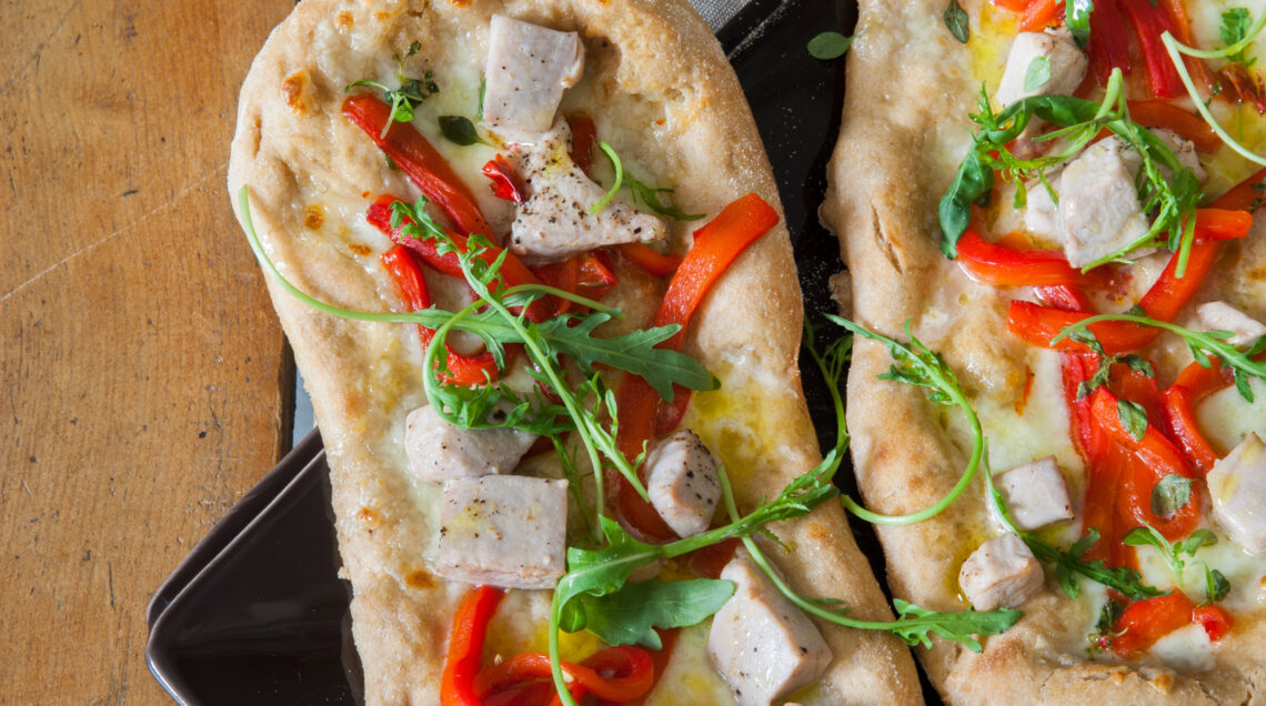 3) Completa e cuoci. Riscalda il forno a 250° e dividi la pasta in 4 porzioni e tirala con le mani per formare 4 pizze allungate e sottili, trasferiscile in una teglia rettangolare per pizza unta con un po’ di olio. Cospargi le pizze con i dadini di fior di latte e cuocile per 10 minuti, poi distribuisci il peperone condito sulle pizze e prosegui la cottura per 5 minuti. Aggiungi infine i pezzetti di tonno e completa la cottura della pizza di farro con tonno e peperone rosso per altri 3 minuti, fino a quando il pesce comincia a scurire. Prima di servire, guarnisci con la rucola e irrora, se ti piace, con olio al peperoncino.