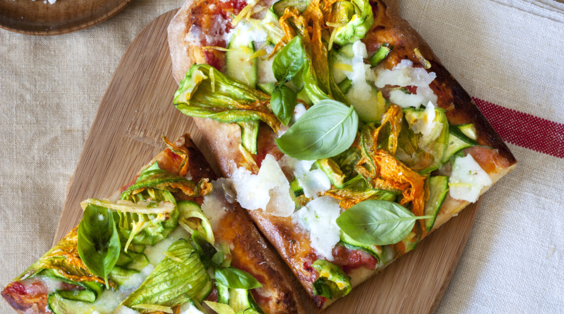 4) Quando la pizza è pronta guarniscila con i fiori di zucca conditi e la scorza di limone ben scolata. Completa con scaglie di pecorino, un filo d'olio e, se ti piace, con pepe appena macinato.