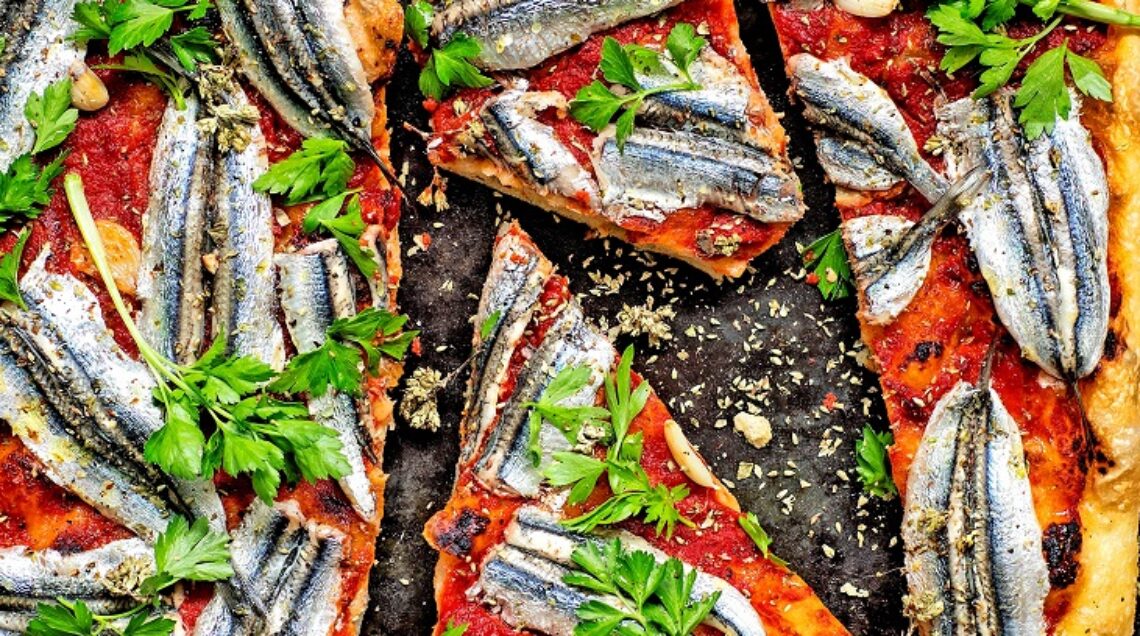3) Spalmate la base della pizza con la salsa di pomodoro e infornate a 230° per 15 minuti. A metà cottura aggiungete gli spicchi d'aglio sbucciati e schiacciati. Quindi togliete dal forno, distribuite le acciughe, pulite, diliscate, aperte a libro e salate, infornate altri 5 minuti. A cottura ultimata completate con un filo di olio crudo, origano fresco e secco. Servite calda o tiepida.