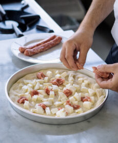 2) Stendi l'impasto nella teglia e fallo lievitare per 3-4 ore a temperatura ambiente. Distribuisci sopra la mozzarella tritata e la salsiccia spezzettata e cuocila in forno a 220° per 15 minuti.