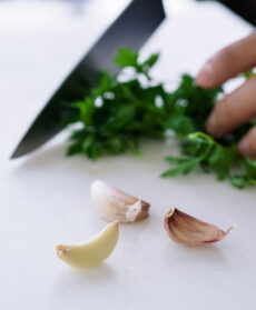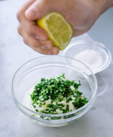 4) Preparate lo tzatziki: riunisci in una ciotola lo yogurt, l'aceto, lo zucchero, il trito di aglio e prezzemolo e il succo di limone, amalgama il tutto con una frustina.