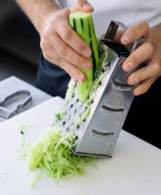 5) Sbuccia i cetrioli con un pelapatate.Grattugiali con la grattugia a fori grossi, mettili in una ciotola e condisci con sale e olio.