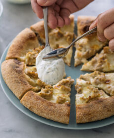 7) Servi la pizza con salsiccia di pollo, cetrioli e salsa tzatziki ben calda.