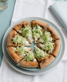 6) Sforna la pizza, tagliala a spicchi e guarniscila con la salsa e i cetrioli grattugiati.