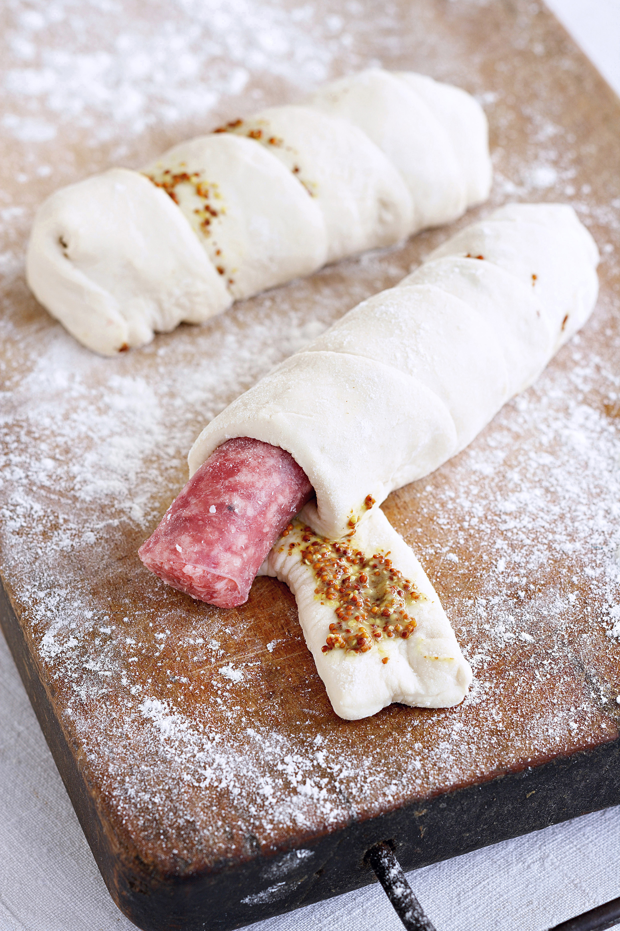 3) Dividi la luganega in 4 parti, taglia la pasta in 4 strisce, spalmale con la senape, salale appena e avvolgine ognuna intorno a 1 pezzo di luganega. Distribuisci i semi di sesamo sulla superficie degli hot dog e inforna a 190° per 20 minuti. Servi caldo.