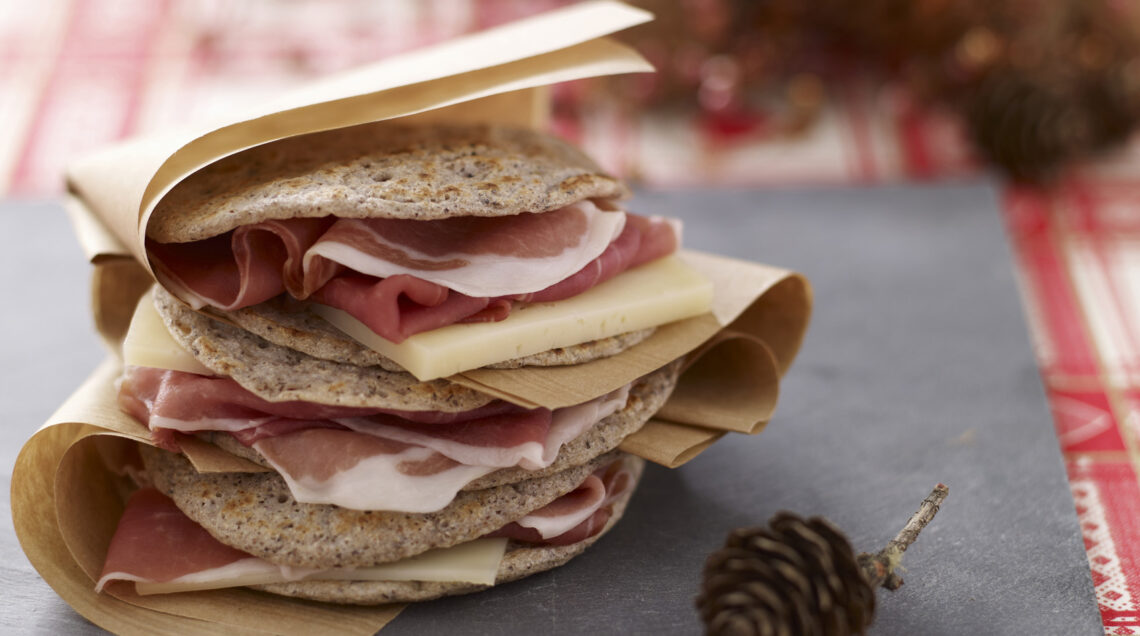 4) Cuoci allo stesso modo 8 pancake in tutto. Via via che sono pronti, impila i pancake su un piatto, tenendoli in caldo. Farciscili due a due con il prosciutto e il formaggio e servi.