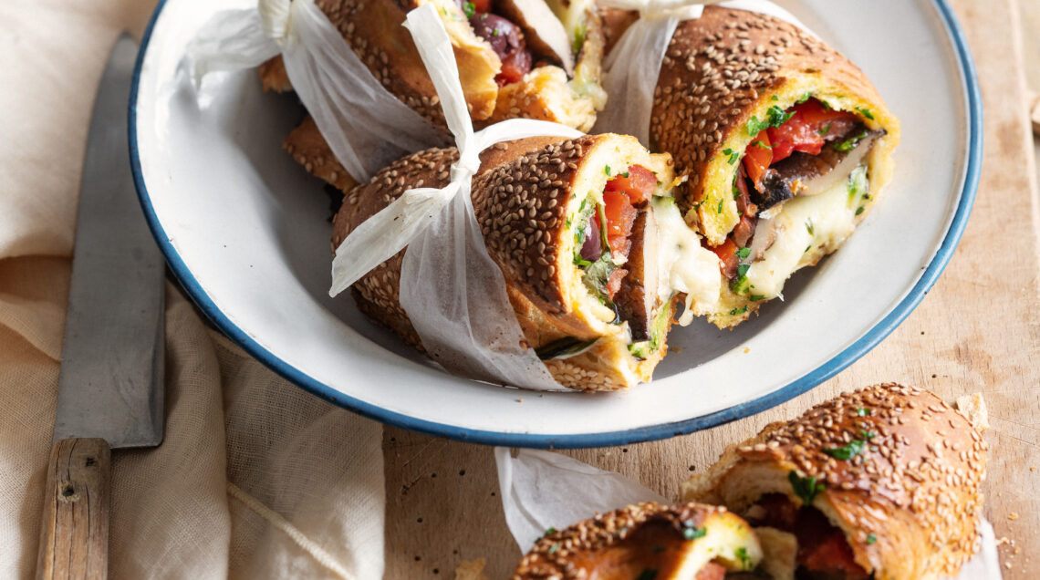 5) Chiudete il pane, legatelo in 4 punti con nastri di carta da forno inumiditi e cuocetelo a 180° per 20 minuti. Tagliatelo in 4 porzioni e servite i sandwich.