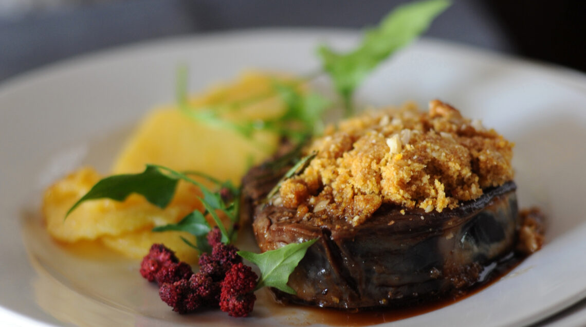 3) Tagliate a fettine il rotolo alle noci, mettete una fetta su ciascun medaglione e passate in forno caldo a 180° per 5 minuti, fino a ottenere una crosta ben dorata. Servite i medaglioni con la polenta e guarnite con gli spinacini e le fragoline di bosco.