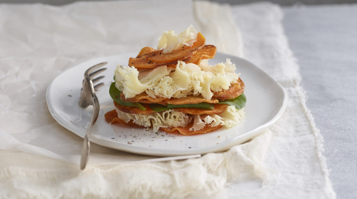 3) Componete le millefoglie. Distribuite in 4 piatti individuali circa 1/3 delle fettine di patate, sovrapponendole in modo da formare un disco. Adagiatevi parte delle rosette di formaggio, coprite con uno strato di patate e proseguite alternado spinacini, patate e formaggio fino a esaurire gli ingredienti. Pepate e servite.