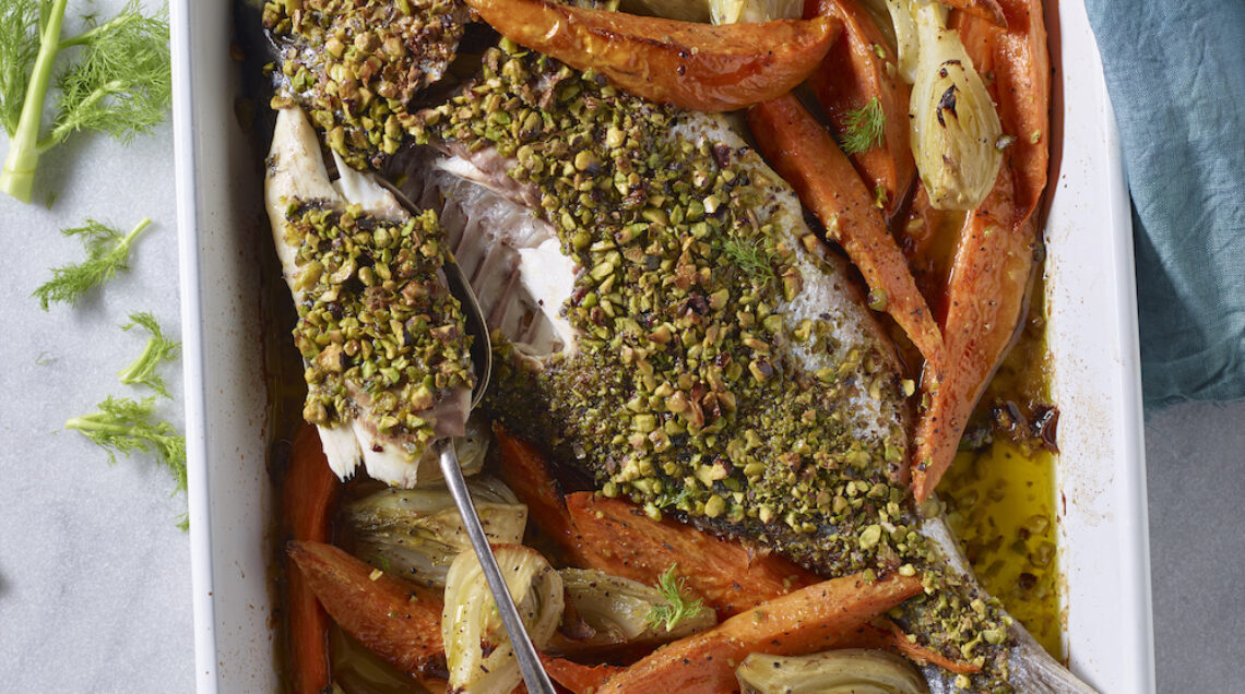 3) Diluite la farina con 100 ml d'acqua e spennellatela sulla superficie dell'orata. Cospargetela con i pistacchi tritati nel mixer e fateli aderire premendo con il palmo di una mano. Disponete le patate e i finocchi lessati intorno al pesce, conditeli con una presa di sale, una macinata di pepe e 6 cucchiai d'olio e cuocete il tutto in forno caldo a 200°per 40 minuti.