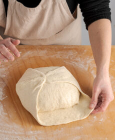 Stendete la pasta in un rettangolo, piegate il terzo superiore verso il centro e poi fate lo stesso con il terzo inferiore: lasciate lievitare ancora 1 ora. Staccate un pezzo di pasta di 300 g e stendetelo in un disco di 25 cm di diametro. Sistematevi al centro la pasta rimasta a forma di palla e richiudete i bordi del disco sulla sommità del pane. Saldate bene i bordi, poi capovolgete il pane (la chiusura deve restare sotto) su una teglia foderata con carta da forno.