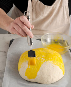 Lasciatelo lievitare per il tempo di riscaldamento del forno a 230° (se avete usato il lievito madre, lasciate lievitare 6 ore abbondanti). Spennellate delicatamente la superficie con il tuorlo sbattuto e spolverizzate con il rosmarino.