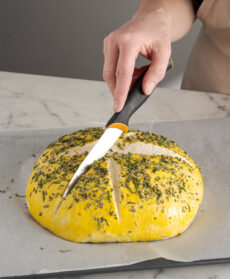 Incidete la superficie della pagnotta con 4 tagli incrociati ad asterisco. Infornatela, abbassate subito la temperatura a 220° e cuocete per 15 minuti. Proseguite la cottura per 15 minuti a 200° e per altri 15 minuti a 180°: se la superficie brunisce troppo, coprite il pane con un foglio di carta stagnola e poi eliminatelo negli ultimi minuti di cottura.