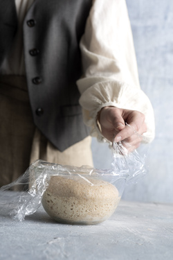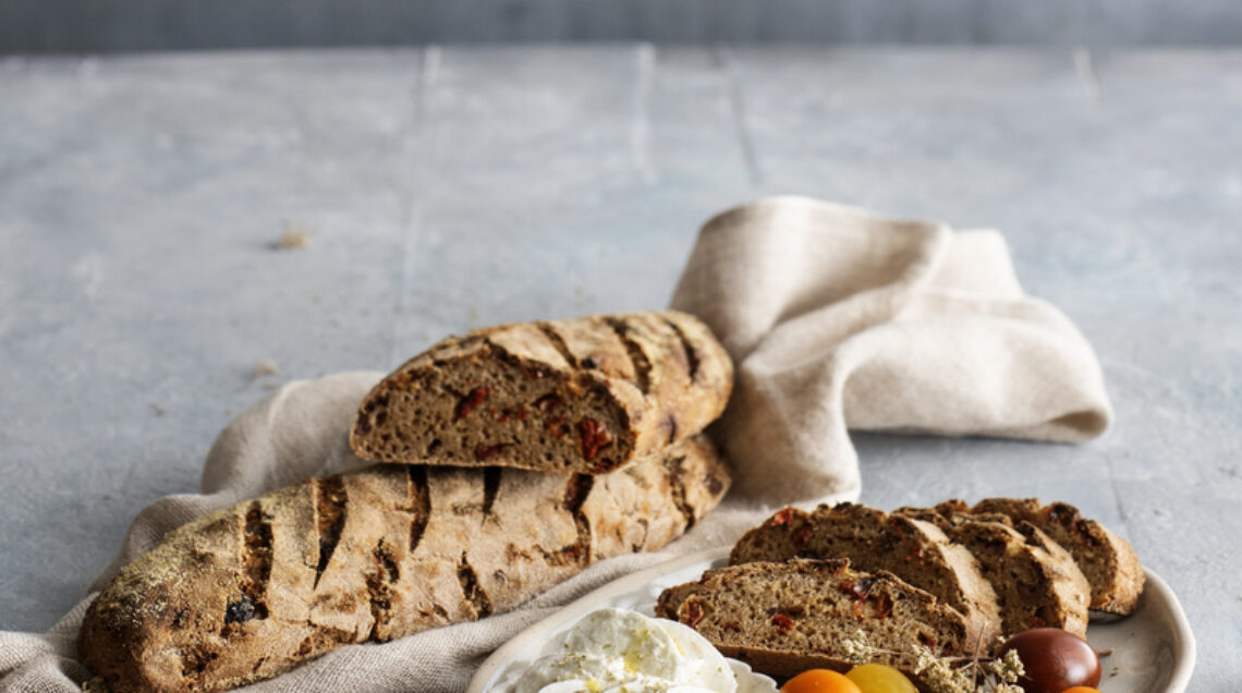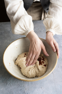 1) Mescolate la pasta madre in 4 dl d'acqua tiepida (28°-30°). Aggiungete le due farine, mescolate, coprite e lasciate riposare per circa 1 ora e 30 minuti. Quindi cospargete l'impasto di sale e lavoratelo come indicato al punto 3 della ricetta di pagina 15. Spezzettate le olive e i pomodori secchi, poi incorporateli al pane in due volte.