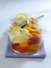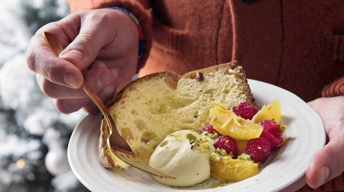 3) Unite allo sciroppo gli spicchi e il succo delle arance e cuocete a fiamma dolce per 2 minuti. Aggiungete i pistacchi tagliuzzati e i lamponi, togliete dal fuoco e servite la frutta calda con il panettone a fette e la crema a ciuffi.