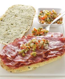 Cuocete in forno a 200° per circa 25 minuti. Controllate che sia ben cotta toccandola in superficie. Coprite il pane con un telo pulito e lasciatelo intiepidire. Fate sgocciolare la giardiniera in un colino, tritatela e conditela con un filo d'olio, 1 cucchiaino di zucchero, sale e pepe. Con un coltello a lama seghettata tagliate la pagnotta a metà, in senso orizzontale, e farcitela con la coppa e la giardiniera; quindi servitela tagliata a tranci.