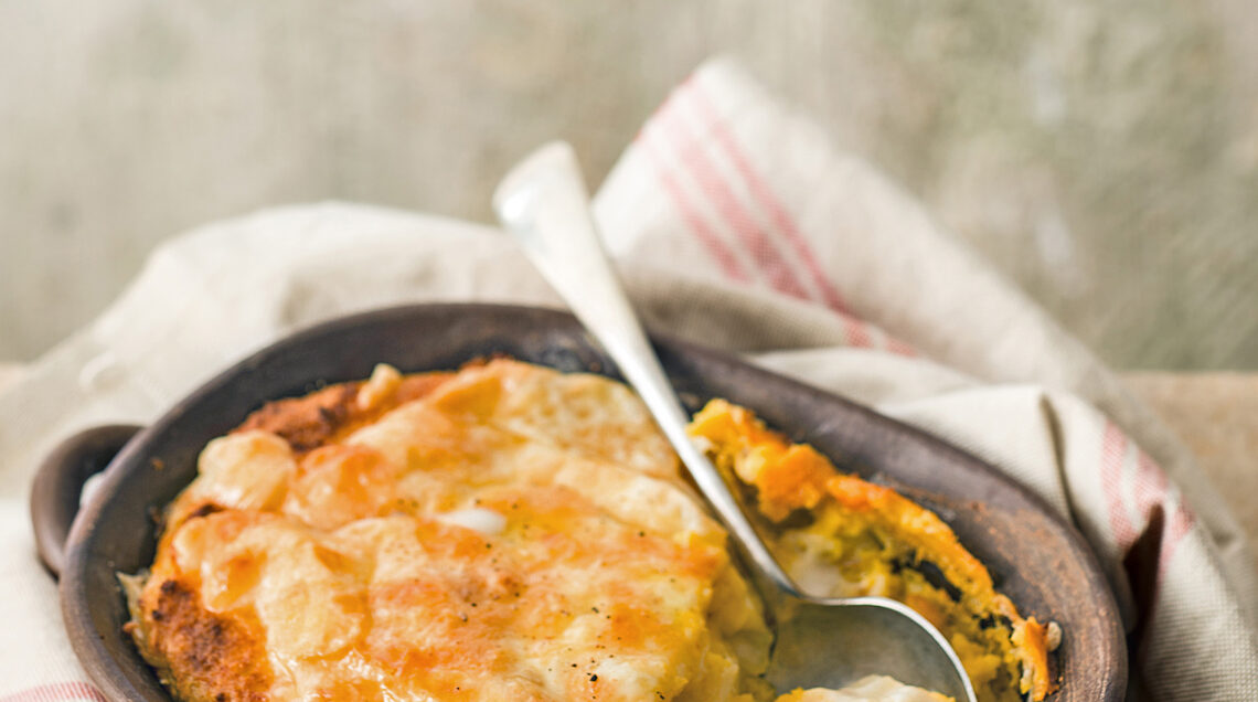 3) Imburrate il fondo di una teglia rettangolare (circa 22x17 cm), versatevi metà del composto, metà del formaggio rimasto, la manioca e ricoprite con il composto rimanente. Infornate per 45-50 minuti, cospargete la superficie con il formaggio rimasto e lasciatelo fondere sotto il grill per circa 5 minuti. Servite il pasticcio caldo accompagnato, se vi piace, con un'insalata di pomodori e cipolla a fettine.