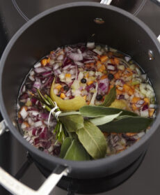 Preparate un trito con il sedano, la carota, la cipolla, l'aglio, la salvia, il rosmarino e la scorza di limone; unite qualche bacca di ginepro e rosolate in olio d'oliva.