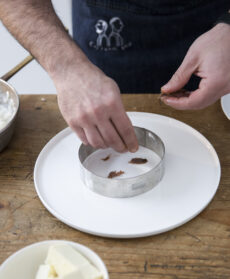 Al posto della farina, una base di riso carnaroli che viene sovrastata da un burro di mozzarella di bufala, gocce di pesto e di pomodoro, polvere di capperi, scorza di limone, un filo d'olio e viene circondata da briciole di pane.