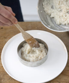 Impiattate con l'aiuto di un coppapasta rotondo, in modo che il risotto ricordi una pizza. Mettete sul fondo di ogni piatto 1 acciuga spezzata con le mani, adagiatevi il risotto, completate con gocce di passata di pomodoro e di pesto, polvere di capperi, scorza di limone e un filo d'olio, disponendo intorno le briciole.