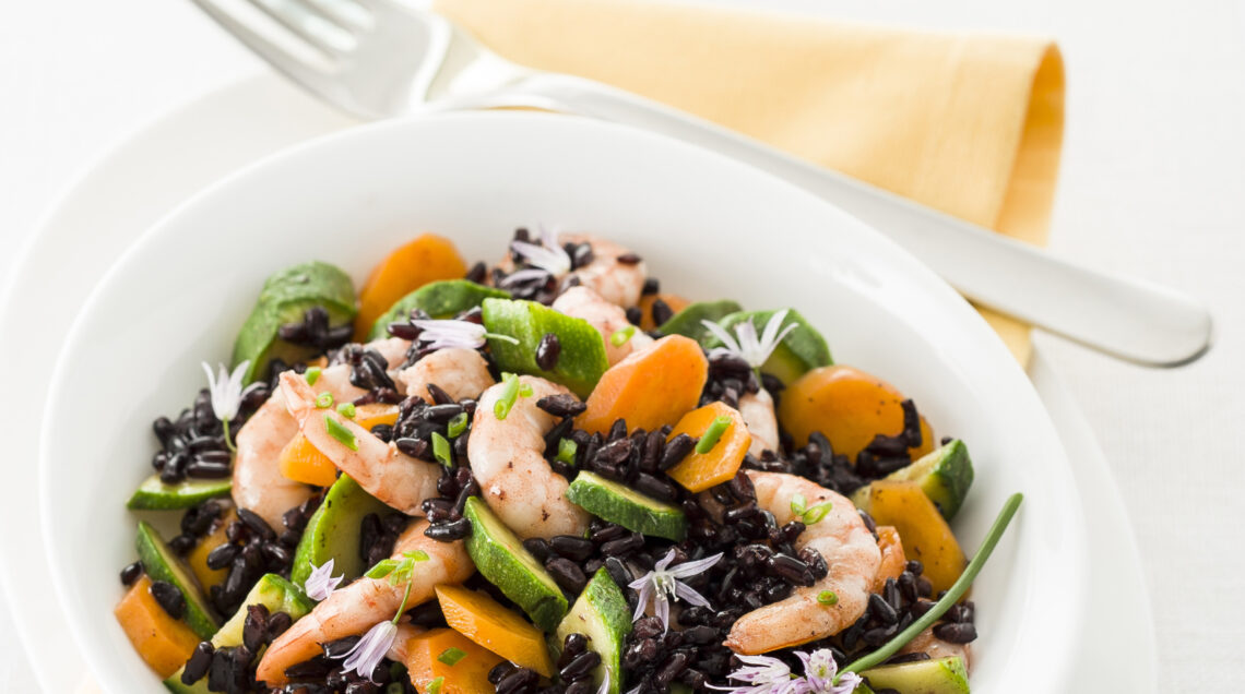 Un tocco esotico per un piatto molto amato in estate, da preparare in maggiore quantità e gustare fino a due giorni dopo, conservato rigorosamente in frigorifero. In questa versione le verdure, i gamberetti, il peperoncino e l'erba cipollina avvolgono il chicco del riso Venere, saporito e intrigante per un piatto ideale anche in caso di ospiti.