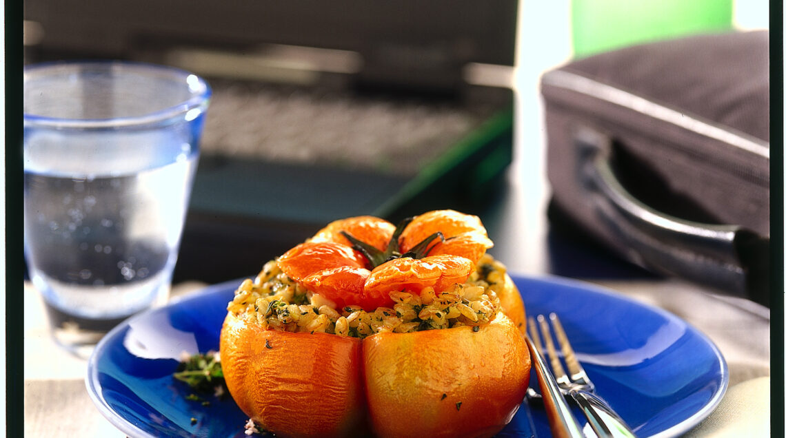 3) Farcisci i pomodori con il farro, crea una cavità centrale e riempila con un pezzetto di robiola. Copri con le calotte tenute da parte e disponi i pomodori ripieni di farro in una teglia rivestita con carta da forno. Irrora con un filo d'olio extravergine di oliva e cuoci in forno già caldo a 180° per 30 minuti. Lascia raffreddare e servi.