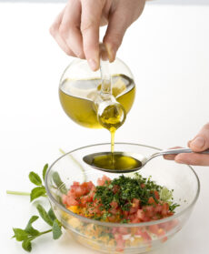 Riunisci in una ciotola i cipollotti, il pomodoro e il peperone giallo, puliti e tagliati a dadini. Aggiungi 2 cucchiai di menta e prezzemolo tritati e 2 cucchiai di olio.