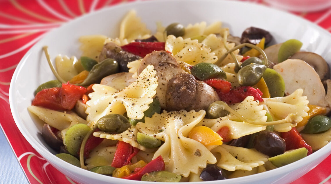 Un primo piatto veloce con verdure, olive e formaggio di capra. Da gustare freddo nella bella stagione