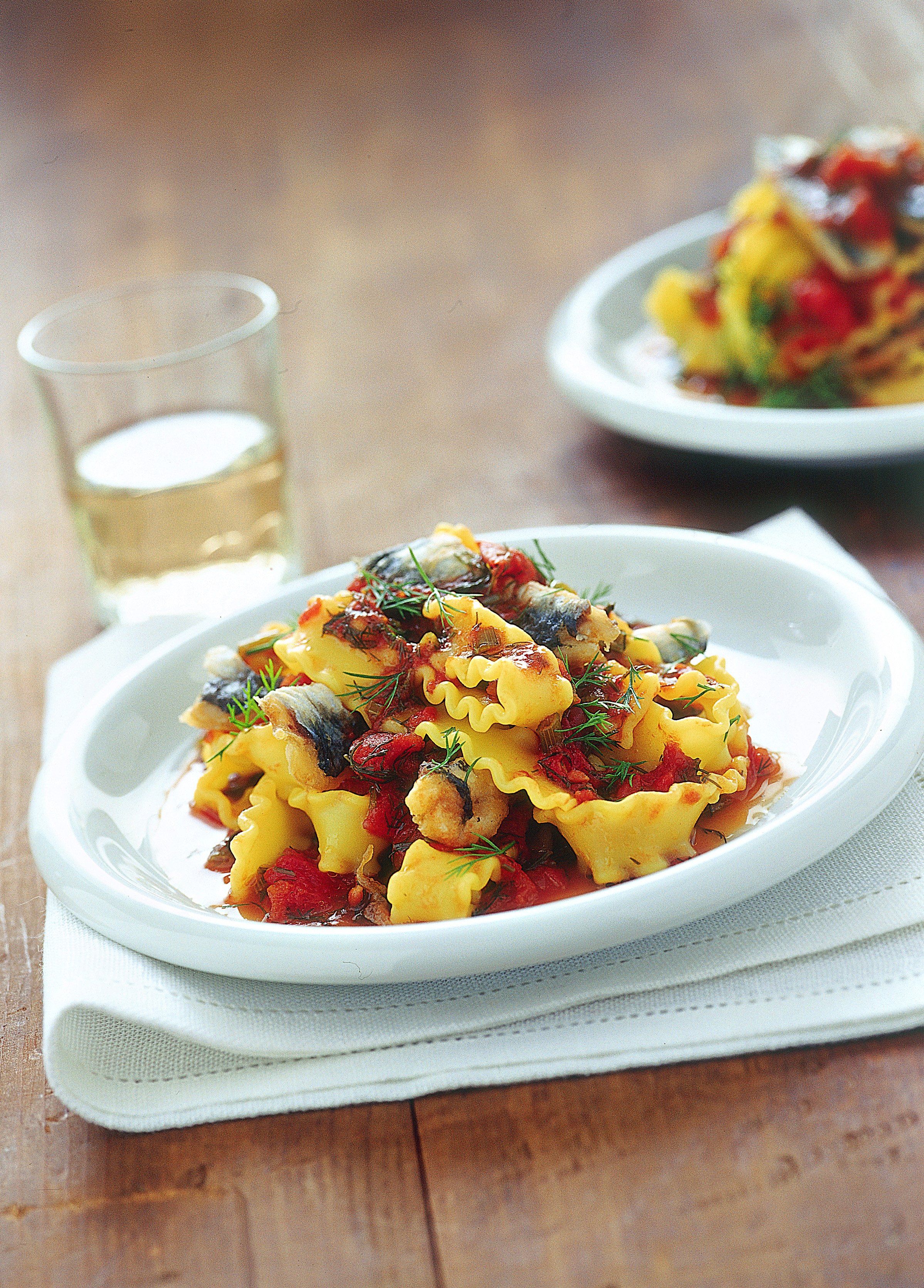 Utilizzate la stessa acqua di cottura del finocchietto per cuocere la pasta (formato reginette) e scolatela quando è arrivata a metà cottura. Prendete una pirofila, ungetela e disponete la pasta a strati alternati con sarde e salsa di pomodoro.