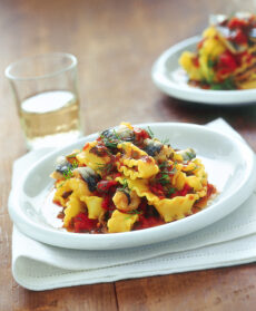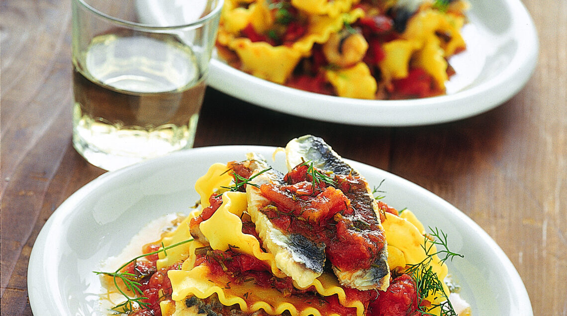 Un primo piatto a base di pesce con sentori mediterranei. Il sughetto di pomodoro aggiunge colore e una nota dolciastra al piatto