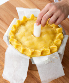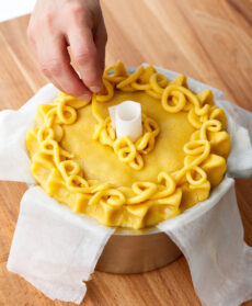 Chiudi il timballo stendendo la rimanente frolla in un disco del diametro dello stampo e appoggialo sul ripieno; riporta verso l'interno la pasta eccedente e pizzicala tutt'intorno per sigillarla.