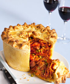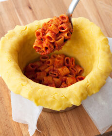 Terminate queste operazioni, prepara una pasta frolla con farina, burro, i tuorli e lo zucchero: avvolgila in pellicola e tienila in frigo per 10 minuti. Mentre aspetti, lessa i maccheroni al dente e condiscili con la rimanente salsa di pomodoro e metà del grana.