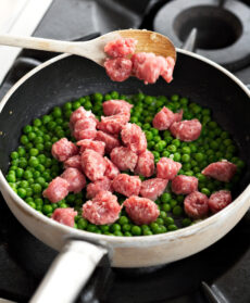 Mentre le polpettine friggono, inizia a cucinare il ripieno: fai soffriggere la cipolla tritata con poco olio. Quando avrà preso colore, unisci i piselli e la salsiccia a pezzetti, bagna con il vino e fai sfumare. Aggiungi qualche cucchiaio della salsa di pomodoro preparata e i funghi, che hai già precedentemente ammorbidito in acqua. Ora unisci al sugo le polpettine, prosegui la cottura per 10 minuti, regolando di sale se necessario.