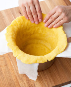 Prendi una tortiera, fodera con carta da forno e stendici 2/3 della pasta frolla: deve leggermente sbordare dallo stampo.