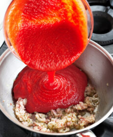 Inizia la lavorazione della ricetta timballo di maccheroni dalla preparazione del sugo: fai soffriggere una cipolla e la pancetta tritate con 2 cucchiai di olio, unisci la polpa di pomodoro passata e il concentrato, regola di sale e pepe.