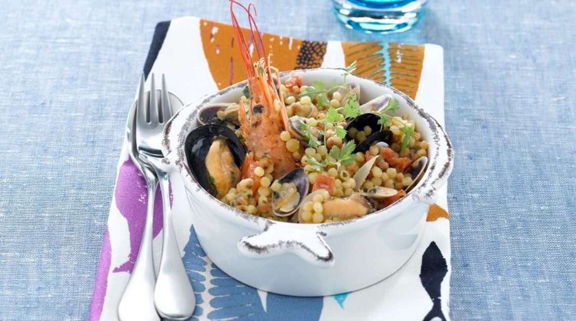 5 Levate il coperchio, versate il brodo di pesce e la fregola, mescolate e portate a bollore. Rimettete il coperchio e fate sobbollire per 5 minuti o finché la fregola è cotta. Scoperchiate, mescolate bene, profumate con il prezzemolo rimasto, lasciate insaporire ancora per un paio di minuti e portate in tavola.
