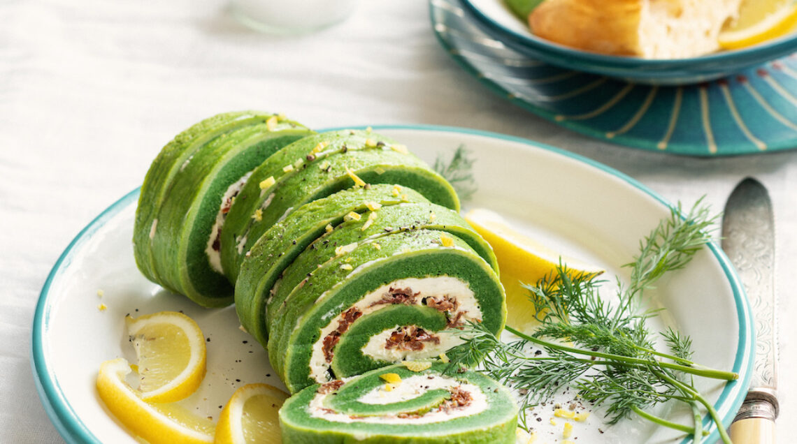 1) Iniziate la preparazione del rotolo di frittata verde, formaggio e pomodori secchi. Scottate gli spinacini per 5-6 secondi in una pentola con acqua bollente salata, quindi scolateli e raffreddateli in acqua e ghiaccio; poi strizzateli e frullateli con le uova, sale e pepe e versate il composto in una teglia rettangolare a bordi bassi da circa 22x30 cm, foderata con un foglio di carta da forno. Infornate la frittata a 170° per 20 minuti.