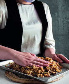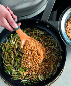 Aggiungete il maftoul e tostatelo a fiamma alta per 2 minuti. Bagnate con il brodo, portate a bollore, unite l'uvetta e 2 prese di sale e proseguite la cottura a fiamma bassa per 20 minuti circa, mescolando di tanto in tanto, finché il maftoul sarà cotto e avrà assorbito completamente il brodo. Allargate il maftoul su una placca per farlo raffreddare.